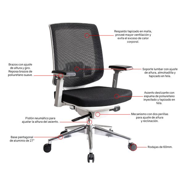 Garantía: De por vida en ruedas, base y pistón. Cinco años en todos los demás componentes, no aplican tela y/o espuma