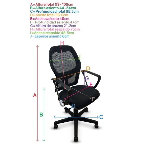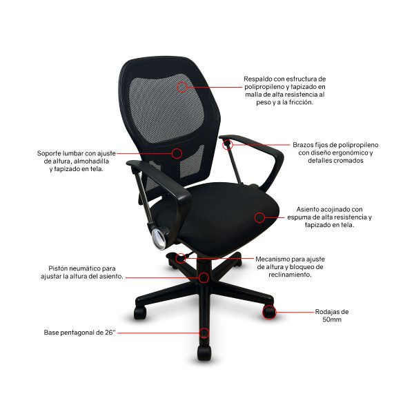 - Respaldo tapizado en malla de alta calidad y resistencia a la abrasión