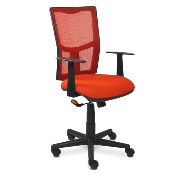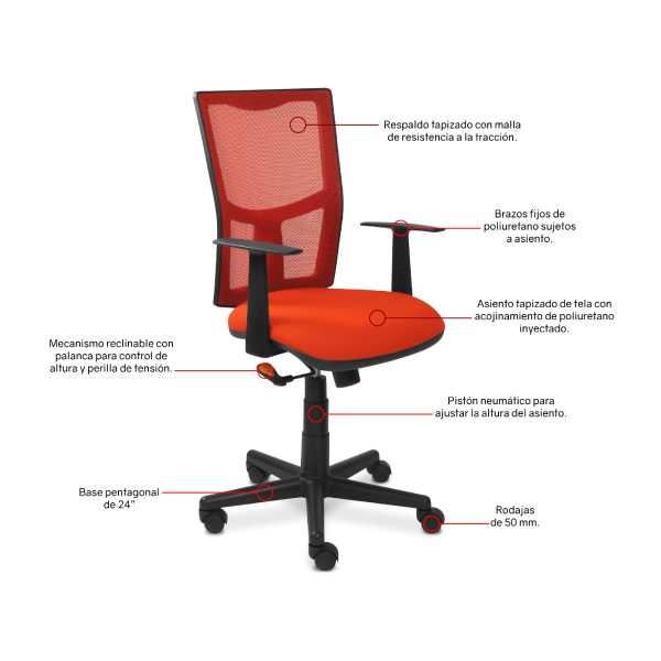 - Respaldo medio tapizado en tela y respaldo en malla de color negro para una adecuada ventilación y soporte lumbar.