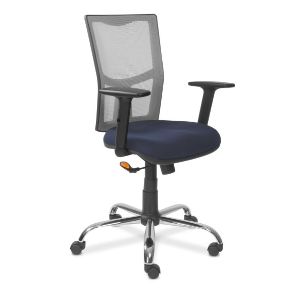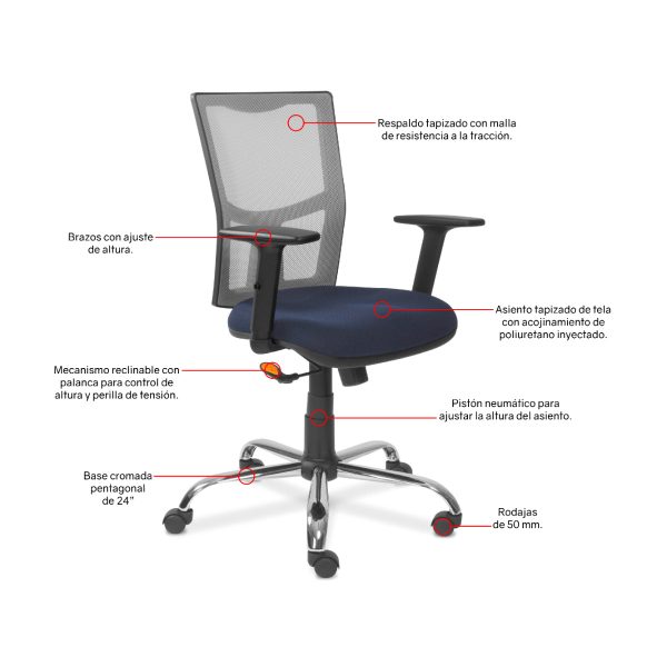 - Respaldo medio tapizado en malla de color negro para una adecuada ventilación y soporte lumbar.