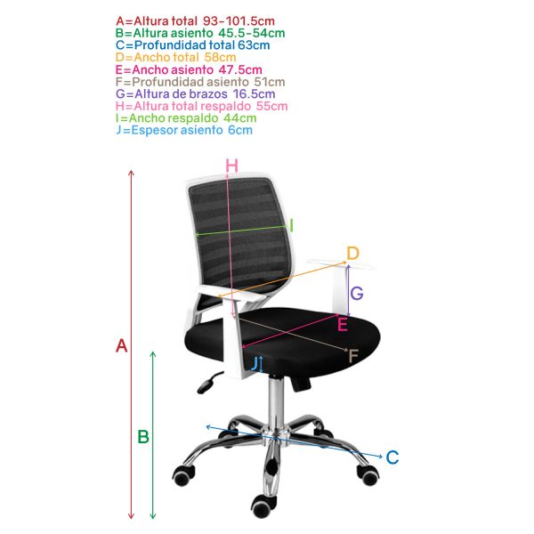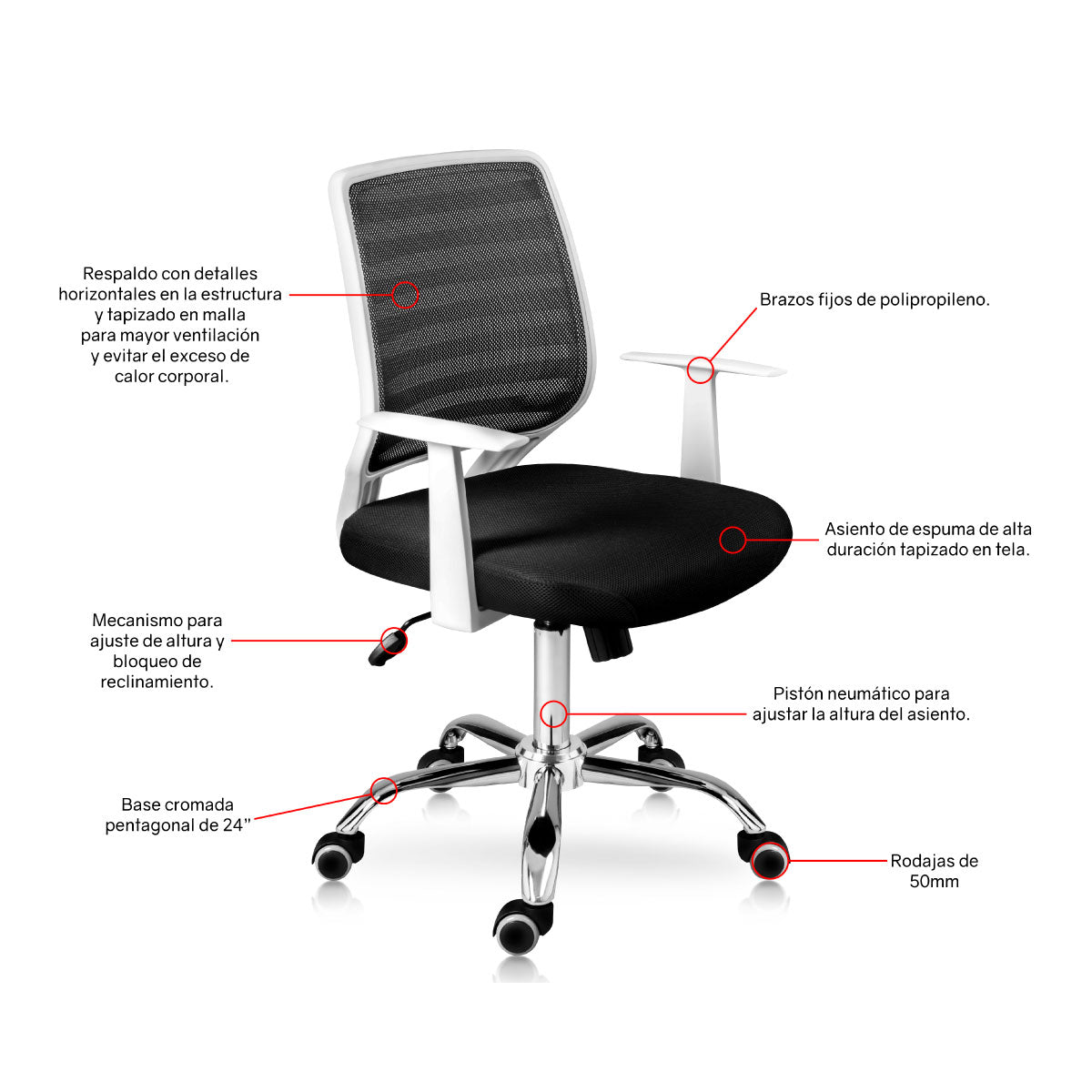 Garantía: De por vida en ruedas, base y pistón. Cinco años en todos los demás componentes, no aplican tela y/o espuma